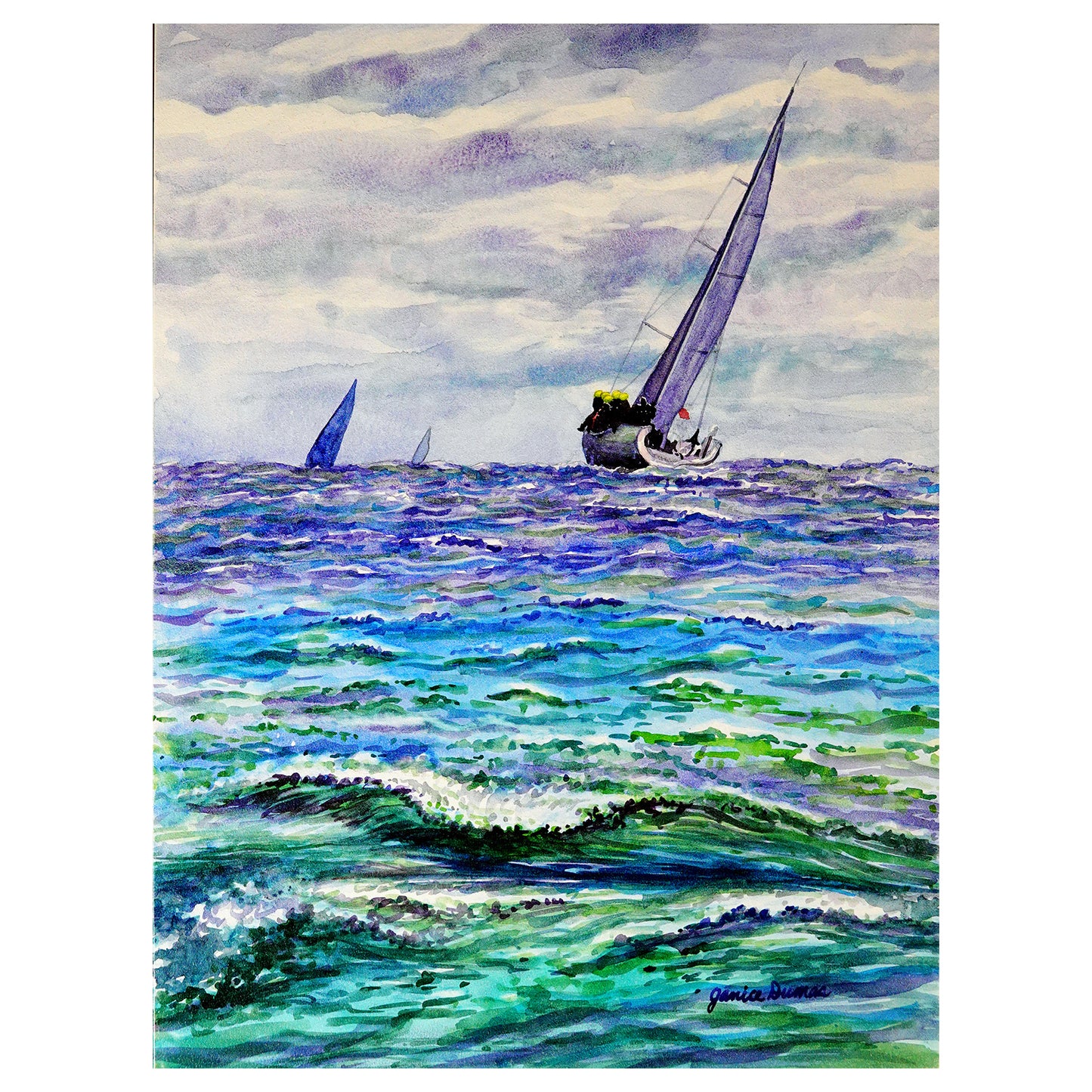 In the Race is an original painting by Michigan Artist Janice Dumas. This piece looks great on an easel or in a frame. The piece is inspired by sailors racing their yachts along the Lake Huron coast on their way to Mackinac Island.
