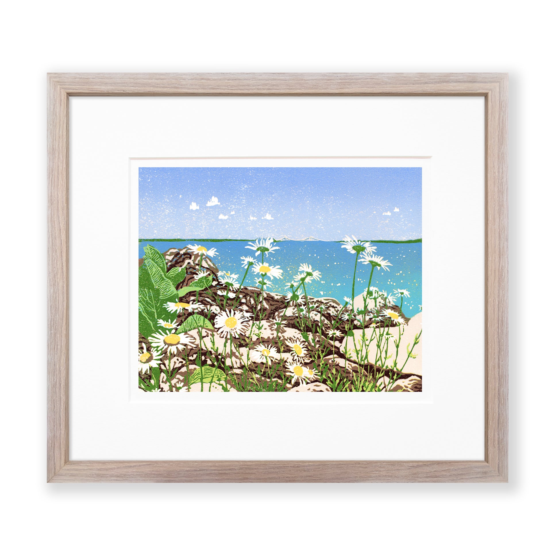 "Daisy Shore" is a 10" x 8" eight-color reduction block print of joyful daisies growing amongst limestone rocks on the Mackinac Island shore. Tucked back in the clear blue sky and turquoise water backdrop is the Mackinac Bridge.