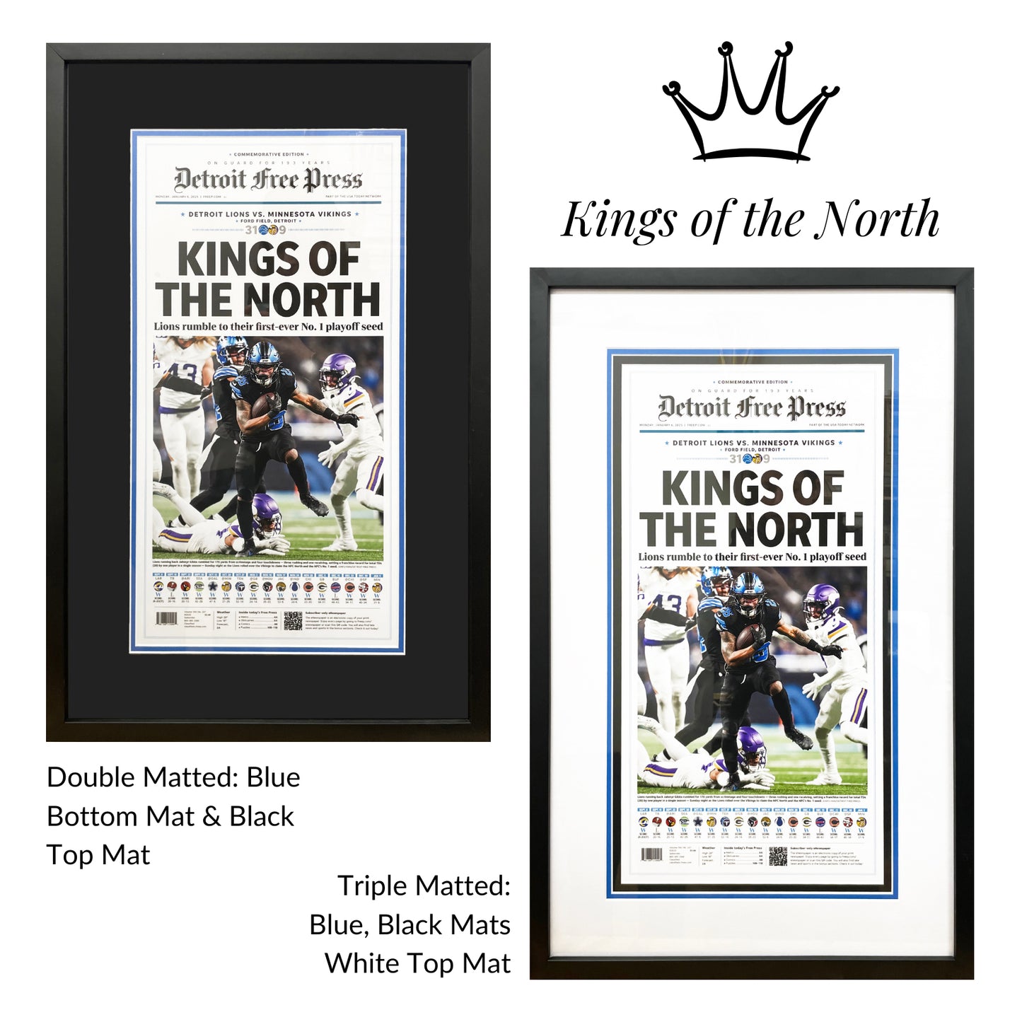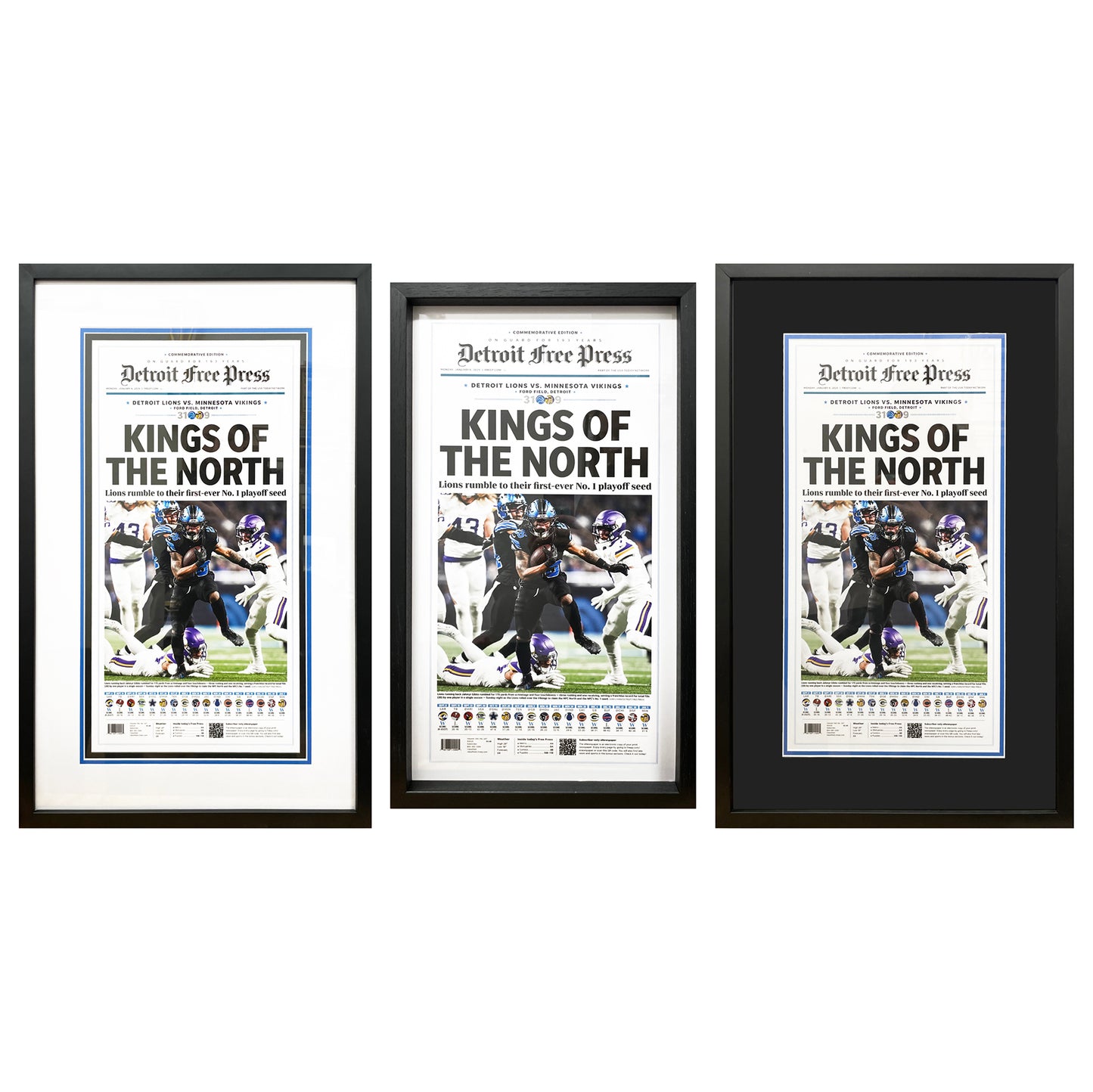 Celebrate the Detroit Lions' victory streak with a custom framed poster showcasing the front page article, "Detroit Lions Kings of the North," from the Detroit Free Press. This archival gem is a must-have for any sports enthusiast. Let's roar, Lions!