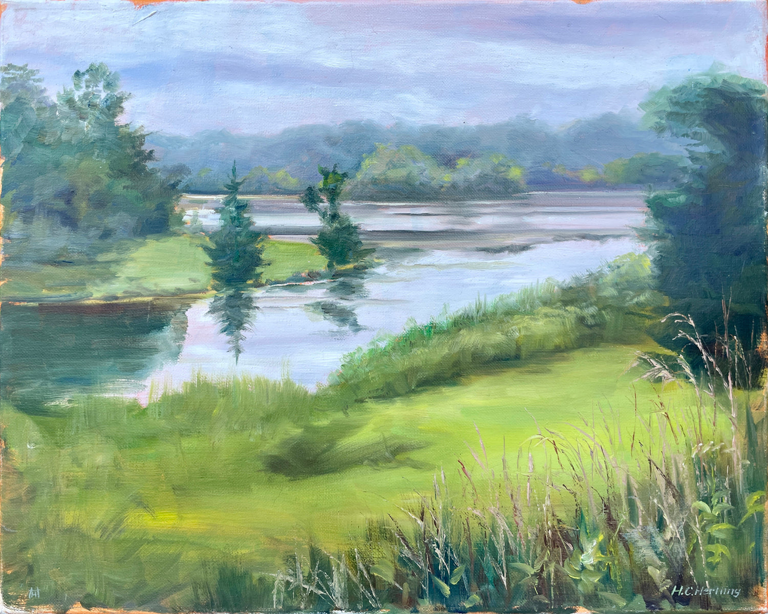 Heiner Hertling’s oil painting captures a river winding through grassy river banks and evergreen trees.