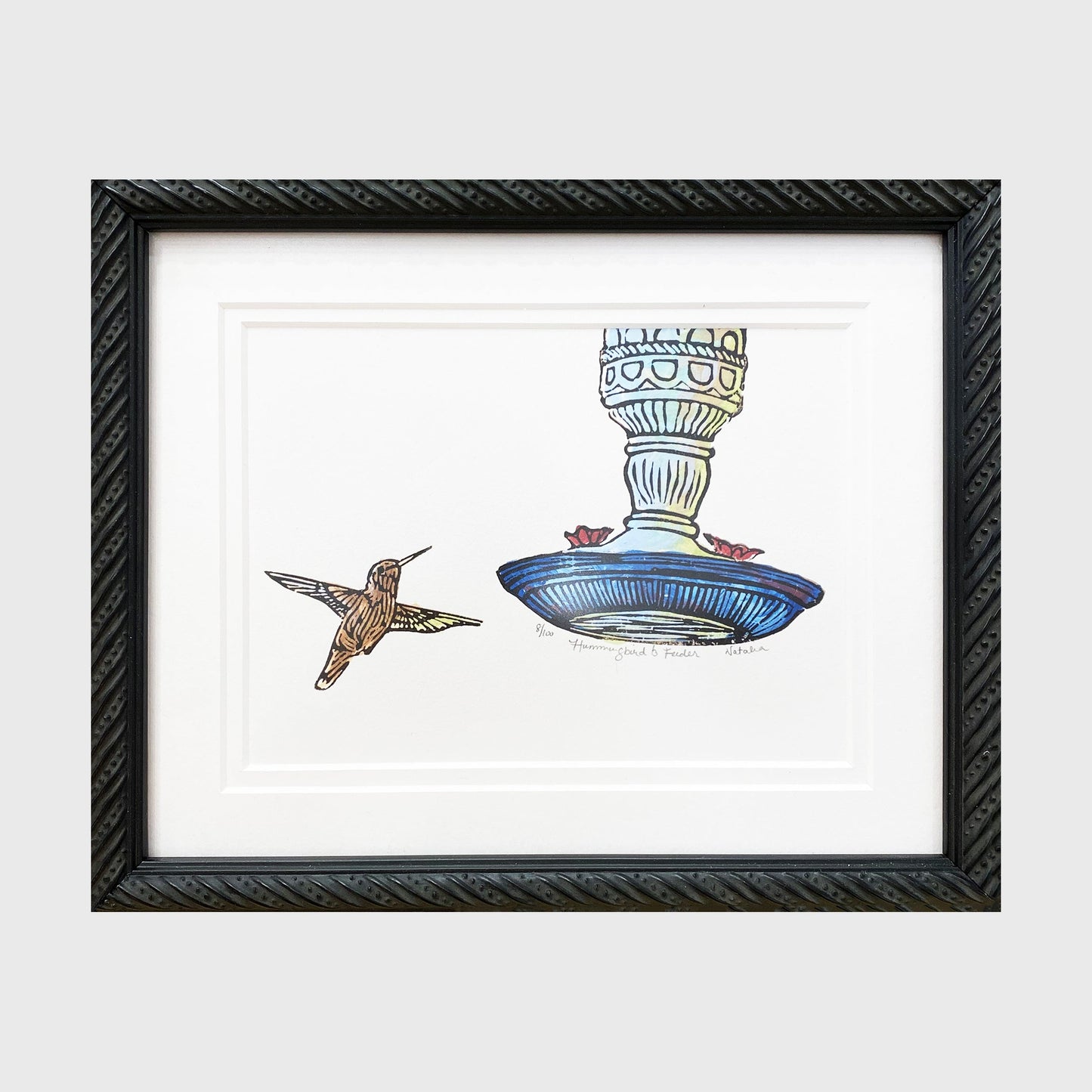 Hummingbird & Feeder is a multimedia block print of a hummingbird as it approaches a hanging glass hummingbird feeder. This print captures a simple, yet beautiful fleeting moment of the small, but mighty, bird in flight. The sight of a hummingbird reminds us to enjoy life's simple pleasures. Before printing the black block, the details underneath were hand-painted.