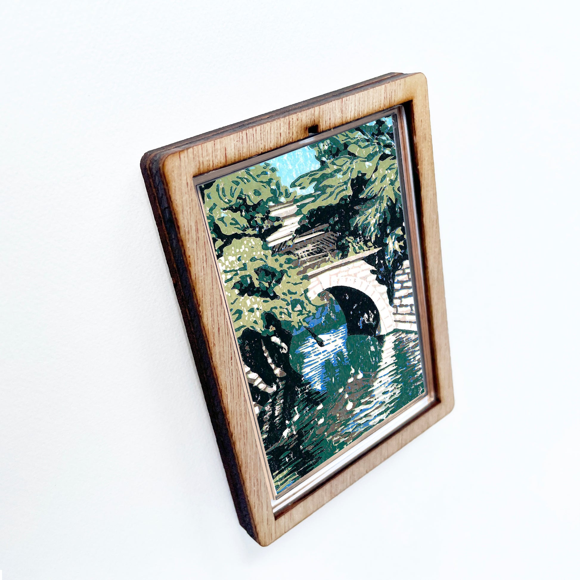 Decorate your fridge, locker or any other metal surface with this charming magnet featuring a solid wood frame and clear lens. The design is a reproduction of a contemporary block print by Natalia Wohletz.