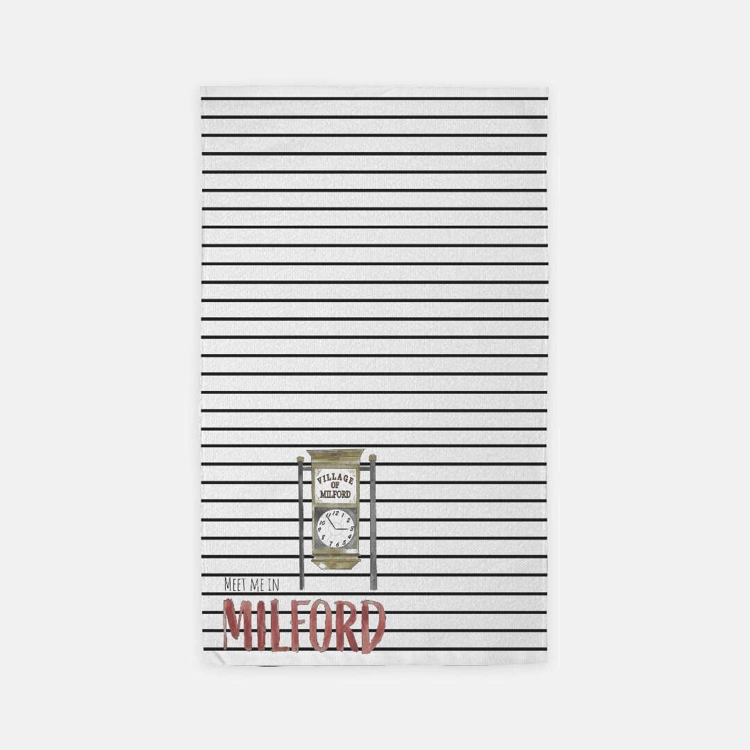 The fun Meet me in Milford towel is a great gift for anyone who loves the small town of Milford. The towel has black and white stripes, and the clock tower featured.