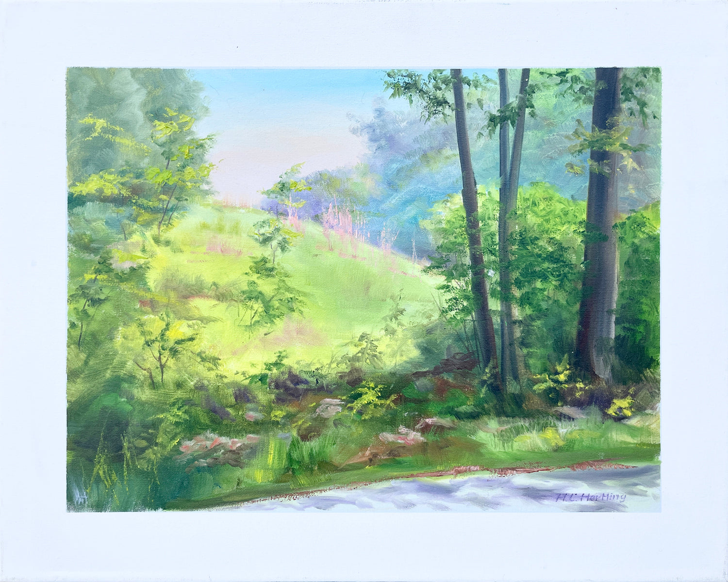 Heiner Hertling’s oil painting captures a bright green grassy meadow emerging from a shaded path in Kensington Metropark. A painted white border around the painting provides a built in "frame."