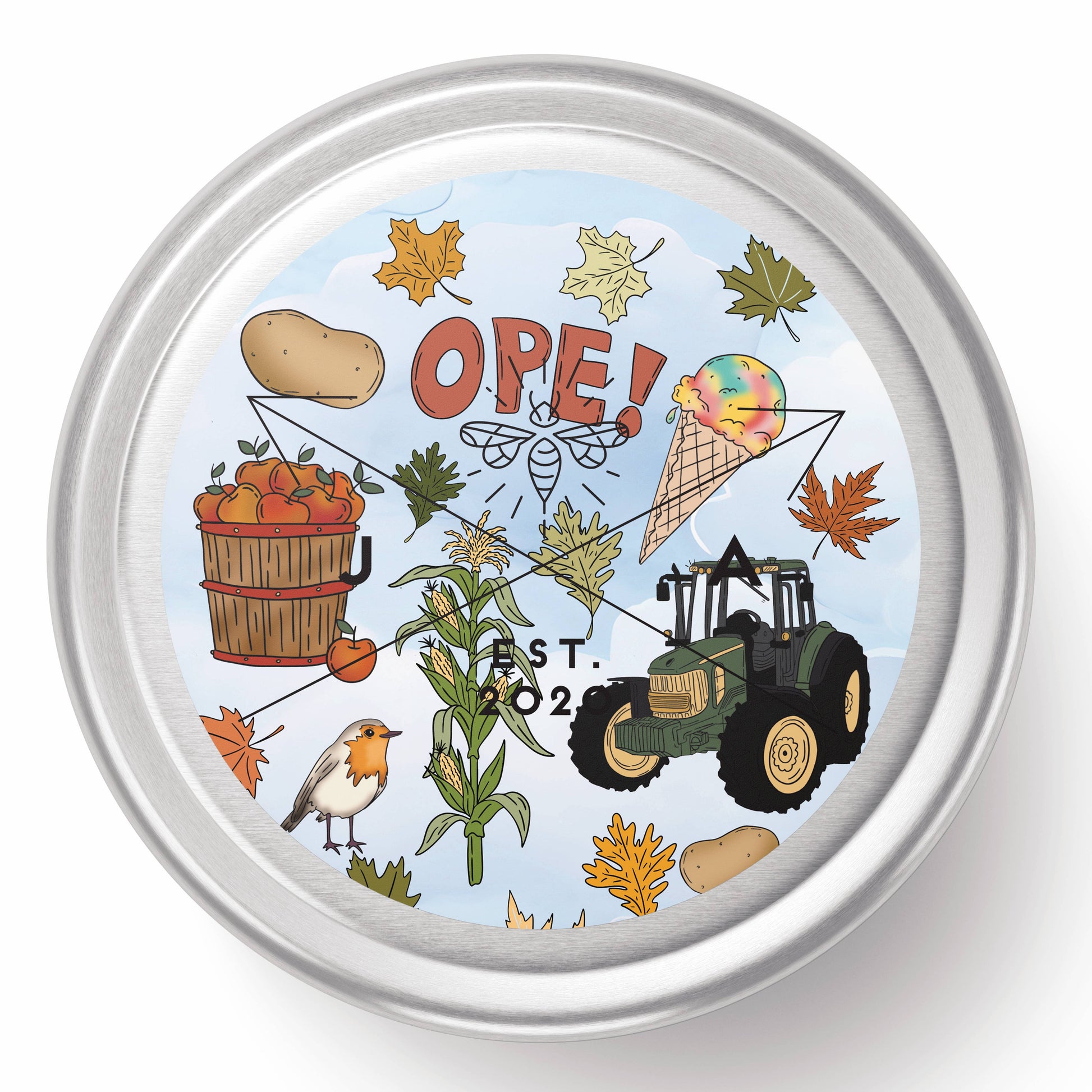 The tin is covered in tractors, cornfields, apples, potatoes and the saying: "OPE"!