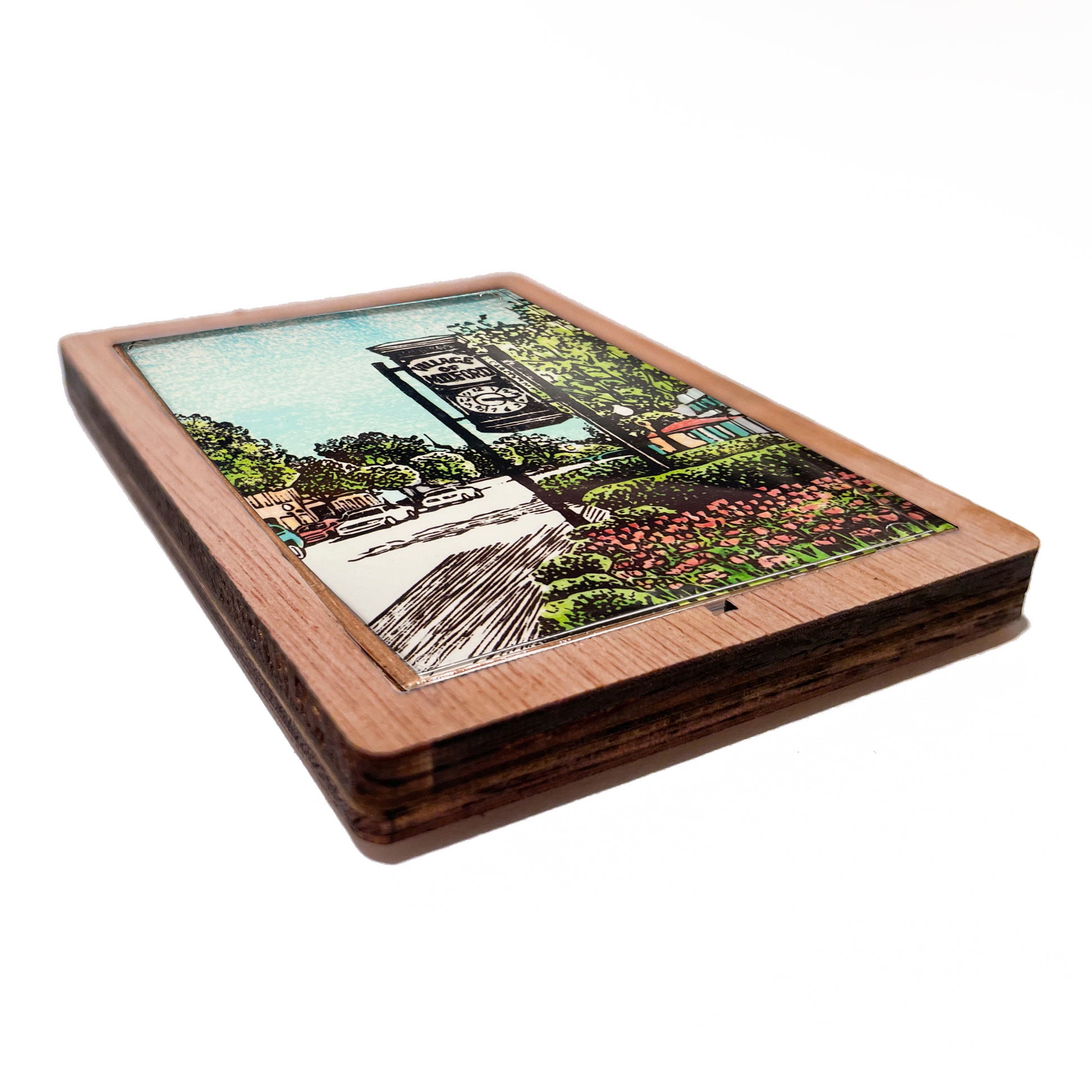 Decorate your fridge, locker or any other metal surface with this charming magnet featuring a solid wood frame and clear lens. The design is a reproduction of a contemporary block print by Natalia Wohletz.