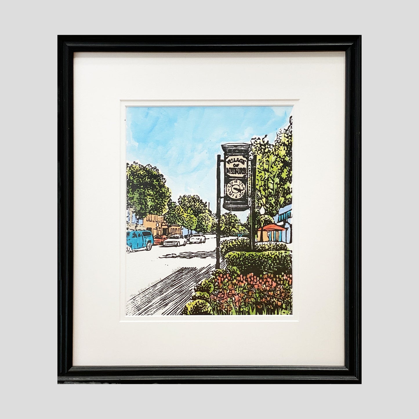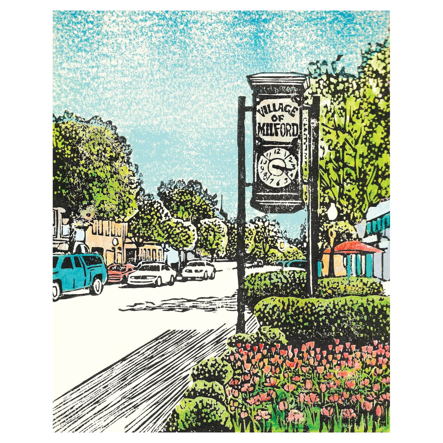 Village of Milford is a mixed media linoleum block print featuring Milford, Michigan's Main Street. Located in Metro Detroit, Milford is a quaint regional favorite for shopping and dining. This print was created with two blocks - one for the sky and one for the black outlines. Before printing the black block, the details underneath were hand-painted.