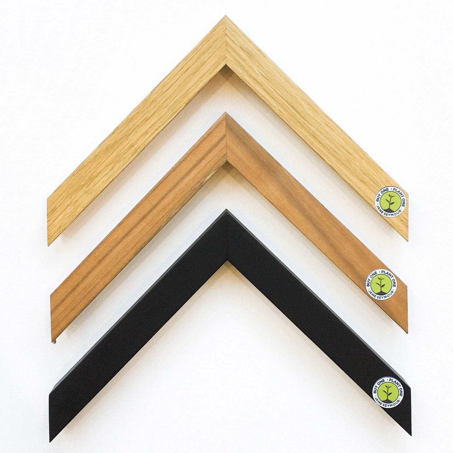 Frame choices include a natural, walnut or black stained 3/4 inch wood moulding from the Jane Seymour (of “Somewhere in Time” fame) Moulding Collection by FOTIOU, which contributes to a reforestation initiative with every purchase. The pine wood frames are responsibly sourced and manufactured with Forest Stewardship Council Certification.